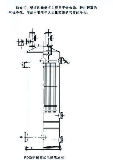本产品由恒流高压直流电源和捕焦本体(机械塔体)两大部分组成,前者选用HL-Ⅲ恒流型静电沉积用高压直流电源;后者结构上可选用TD套筒式(同心圆式),GD管式,FD蜂窝式或SJD湿管式。四种结构的本体均主要由筒体和放电极(电晕极)以及吸捕极(沉淀极)组成。